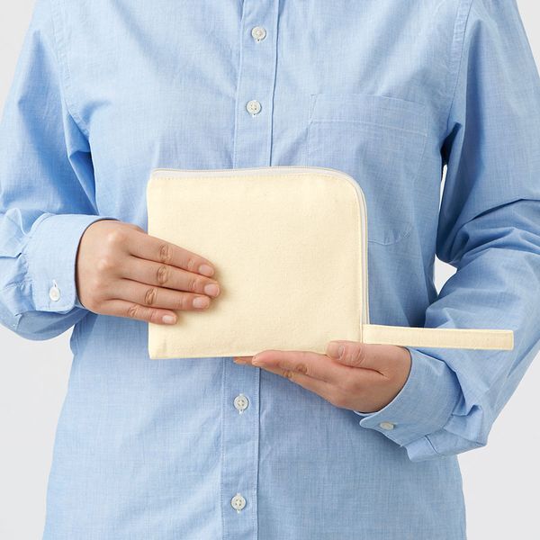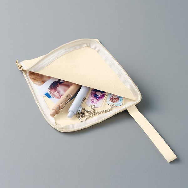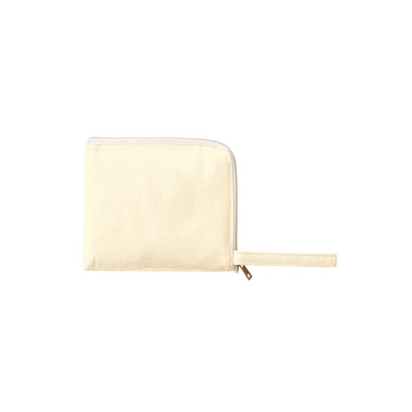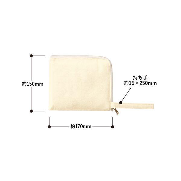 しっかりとした厚手のキャンバス生地を使った、L字ファスナータイプのポーチです。ファスナーがL字に大きく開くので、中身の出し入れがとってもスムーズ。さらにストラップ付きで持ち運びにも便利な、実用性の高いアイテムです。