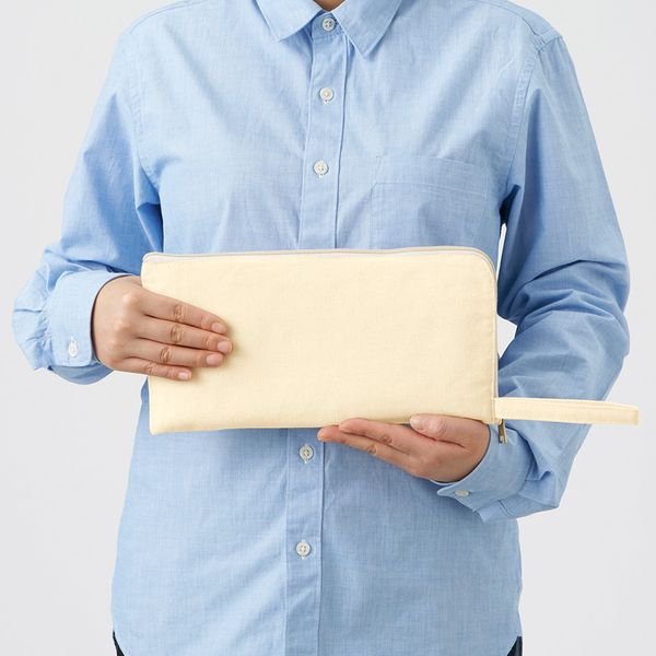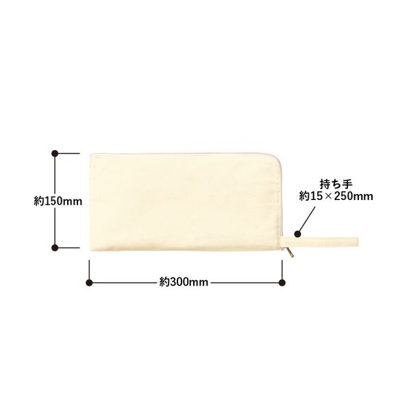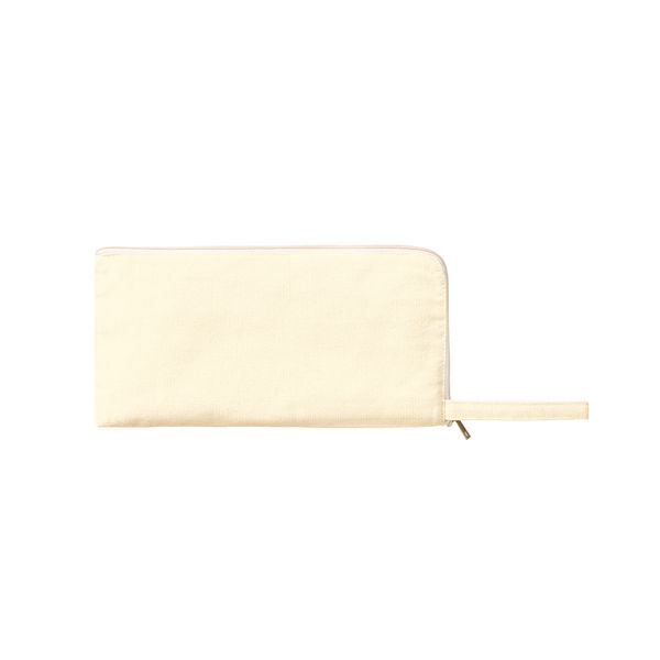 しっかりとしたキャンバス生地を使った、L字ファスナータイプのポーチです。ファスナーは大きくL字に開く仕様なので中身の出し入れがしやすく、ストラップ付きで持ち歩きにも便利。機能性もばっちりなアイテムです。
