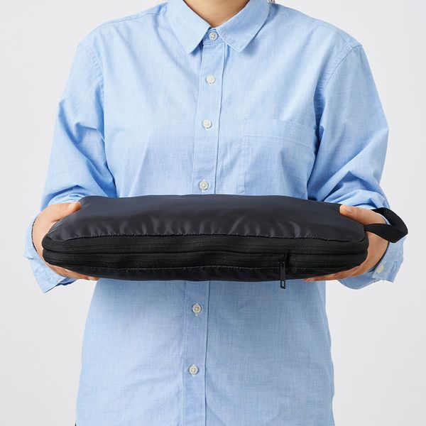 本体には2カ所のファスナーが付いており、空気を抜きながらファスナーを閉じることで、ポーチをコンパクトに圧縮できます。荷物が多くなりがちな旅行シーズンにぴったりのアイテムです。