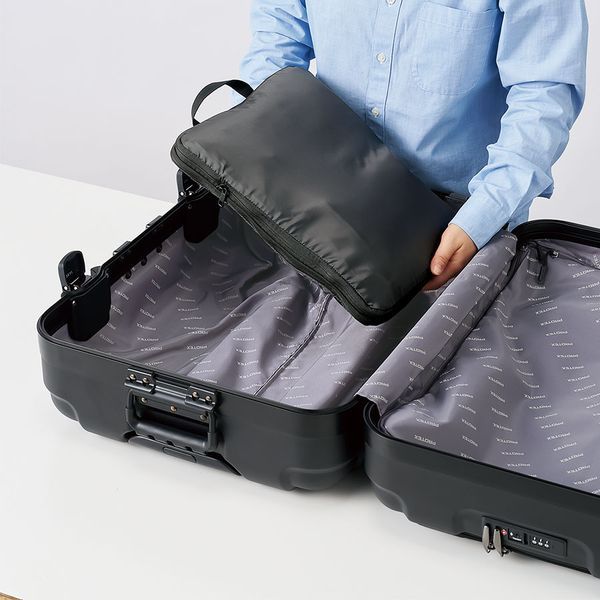 サイズはS・Mの2種類をご用意。Mサイズは夏~秋の2泊旅行にちょうどいいサイズ感で、かさばる衣類もスマートにまとめられます。さらに、持ち運びに便利なハンドル付きなので、旅先での使い勝手も抜群です。
